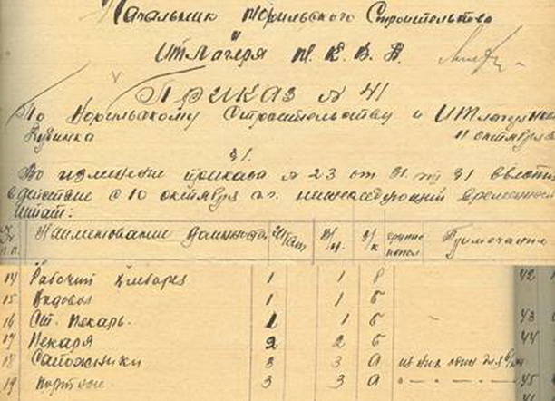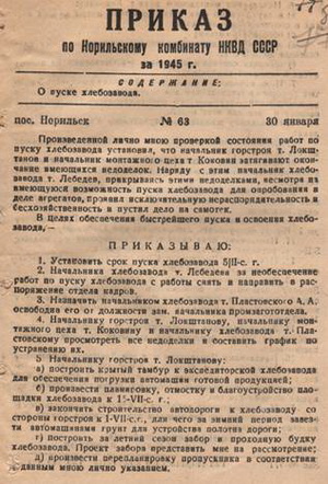 Приказ от 11.10.1935 № 41 Строительство хлебозавода являлось для Норильскстроя первостепенной задачей в части снабжения населения хлебом и первую очередь продукции планировалось выпустить ещё к 7 ноября 1944 года, но состояние работ позволило это сделать немного позднее. В соответствии с приказом начальника Норильского комбината НКВД СССР А. А. Панюкова от 30 января 1945 года № 63 срок пуска хлебозавода был назначен на 5 февраля.