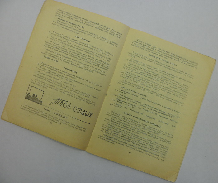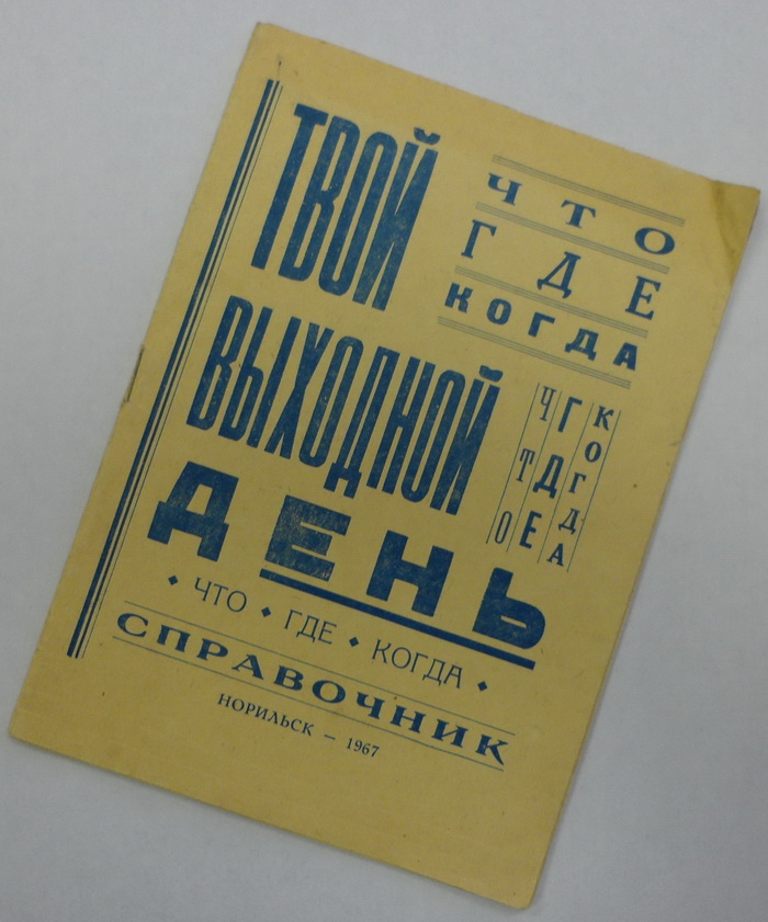 Среди архивных документов встречаются такие, на страницах которых из мельчайших деталей, событий, фактов раскрывается атмосфера целой эпохи. Так, случайно, на глаза попал любопытнейший документ – справочник «Твой выходной день: Что, Где, Когда?». Небольшая, тетрадного формата брошюрка была подготовлена Отделом технической информации и изобретательства комбината и предназначалась для тех, кто приезжал на работу в Норильск. Кстати, в 1967 году в Большой Норильск прибыло 8 900 человек. Да и сам год издания брошюры символичен – 1967-й, юбилейный год Советского государства. Именно в 1967 году у граждан нашей страны появился еще один выходной день – суббота, и эту «уйму свободного времени» по мнению авторов замечательной брошюры, надо было как-то использовать. Своей целью издание имело не просто в очередной раз напомнить новоиспеченным норильчанам, что в городе есть институт, библиотеки, театр и Дворец культуры, а убедить их в том, что «практически нет увлечения, любимого дела, которым нельзя было бы заниматься в Норильске». Далее справочник подробнейше знакомит со всеми сферами городской жизни и жизни поселков – Талнаха, Кайеркана, Медвежки.