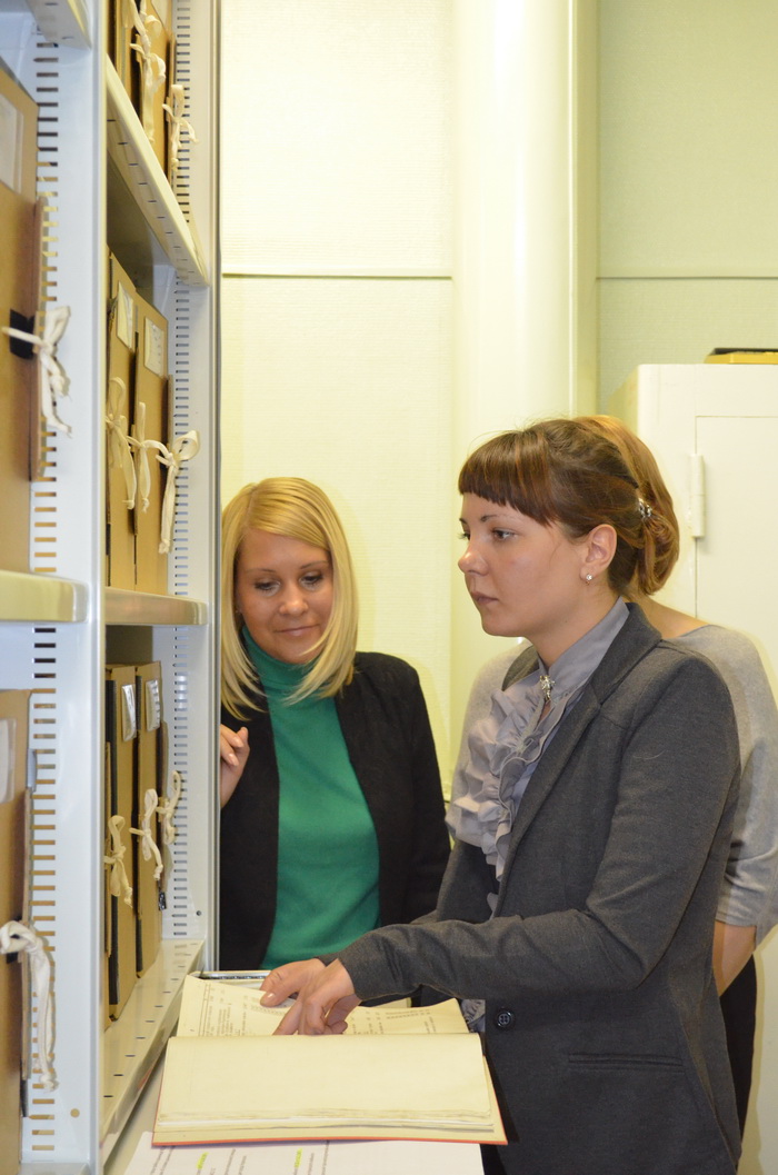 Гостей пригласили и в святая святых любого архива – архивохранилища, чтобы показать, каким образом соблюдается комплекс условий, необходимых для постоянного хранения документов – температура и влажность воздуха, освещенность, охрана документов, и даже разрешили попробовать самостоятельно найти на стеллажах архивные дела, используя в качестве путеводителя архивную опись.
