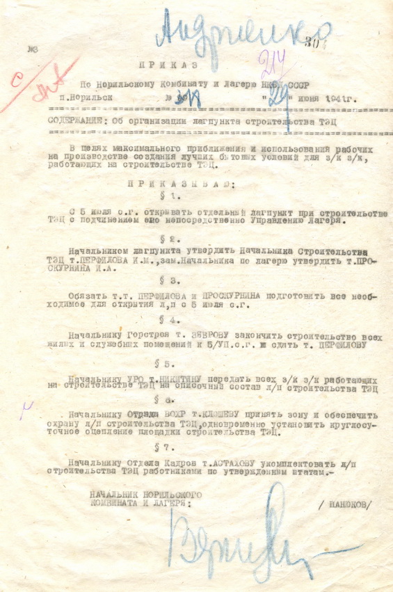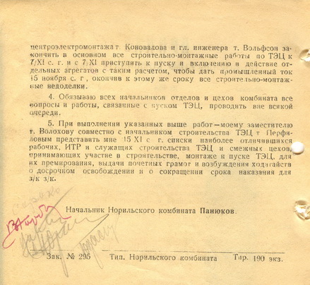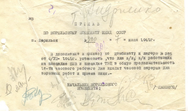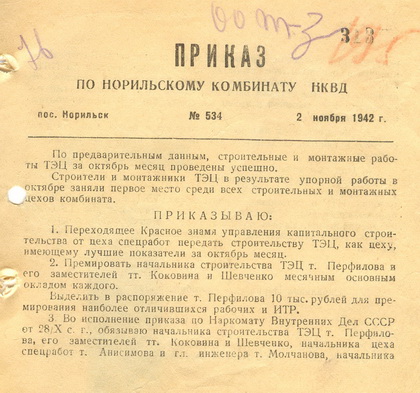Время и обстоятельства вносили свои коррективы в строительство ТЭЦ. Установленные первоначально сроки оказались объективно невыполнимыми. Люди работали на износ. Земляные работы в скальном и вечномерзлом грунте велись вручную. Экскаваторы не работали, компрессоры и перфораторы были получены лишь в конце навигации. Из-за невыполнения плана по земляным работам задержалось возведение фундаментов и металлоконструкций. Для создания лучших условий труда для заключенных, работающих на возведении теплоэлектроцентрали, приказом от 29 июня 1942 года был открыт отдельный лагерный пункт. В ноябре 1940 года приказом начальника комбината А.П.Завенягина начальником строительства ТЭЦ был назначен Иван Макарович Перфилов. Он – выпускник Военно-инженерной академии имени Куйбышева, в Норильске работал до 1947-го., руководил строительством ремонтно-механического завода, обогатительной фабрики.