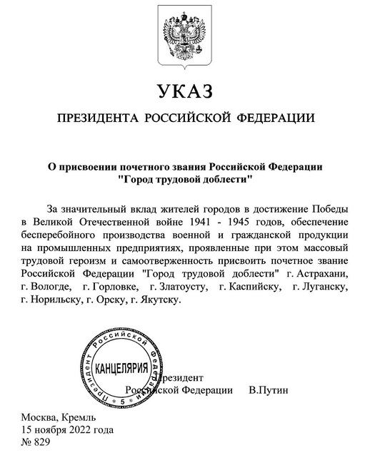 Указом Президента Российской Федерации от 15.11.2022 городу Норильску присвоено почетное звание Российской Федерации «Город трудовой доблести» за значительный вклад жителей города в достижение Победы в Великой Отечественной войне 1941–1945 годов, обеспечение бесперебойного производства военной и гражданской продукции на промышленных предприятиях, проявленные при этом массовый трудовой героизм и самоотверженность.