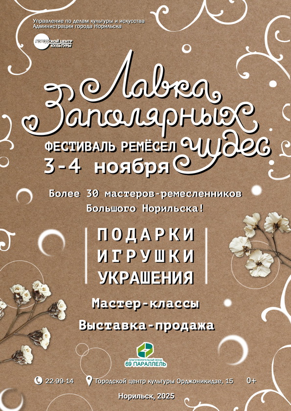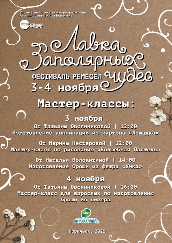3 ноября с 11:00 до 15:00 и 4 ноября с 14:00 до 19:00 в МБУ «Городской центр культуры» пройдёт Фестиваль ручного труда и ремёсел «Лавка заполярных чудес»